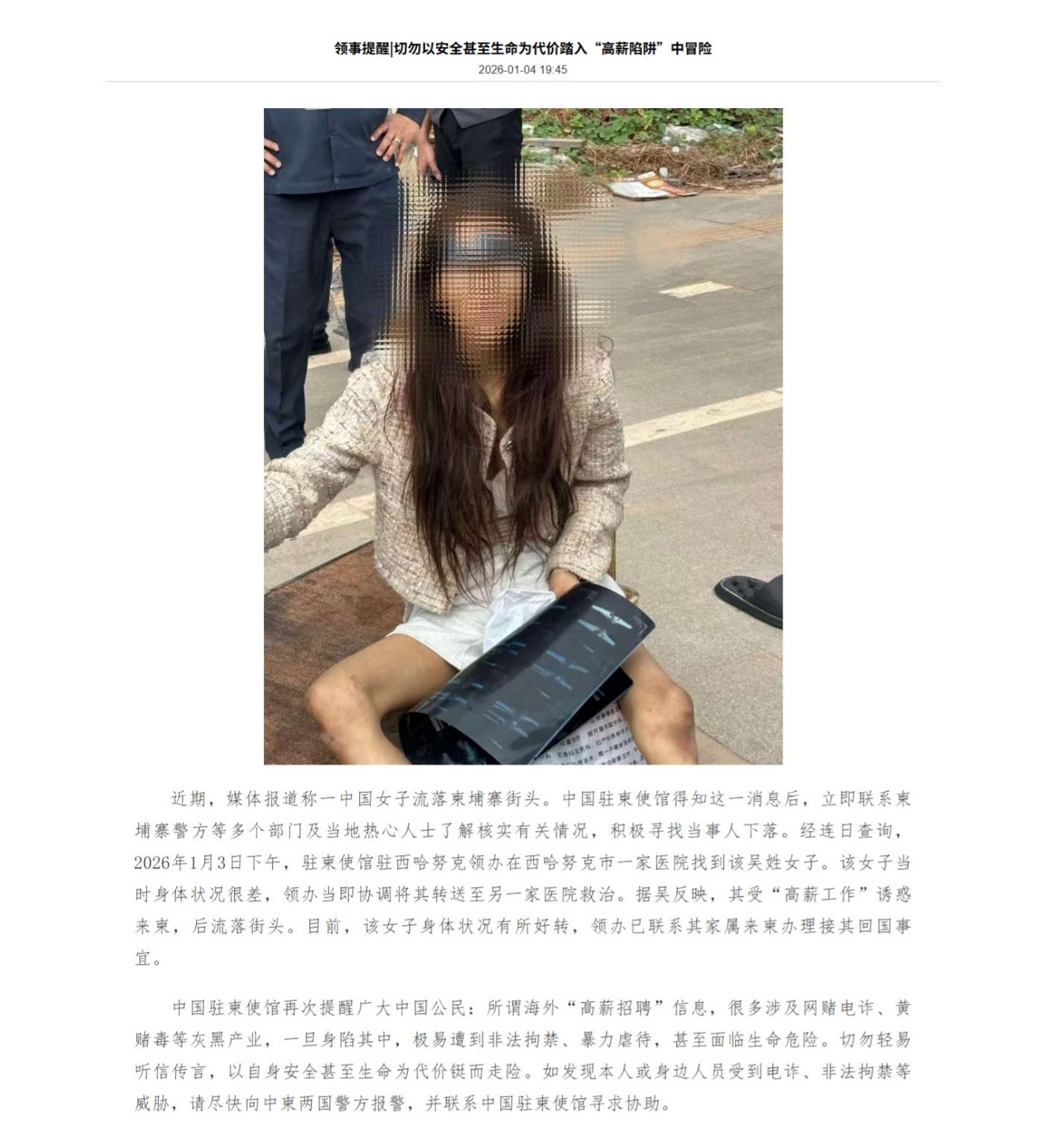 此前,中国驻柬埔寨大使馆发布通报称,吴某桢自称受“高薪工作”诱惑来到柬埔寨,后流落街头。事发后,驻西哈努克领办已联系其家属来柬办理接其回国事宜。